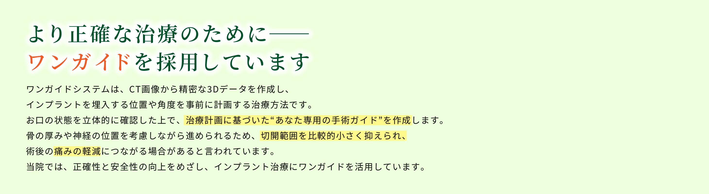 そのCTとは、コンピューターで立体的に撮影ができるものなので、より確実にお口の中を把握することが出来ます。このことにより、痛みが少なく、歯肉を切開しないインプラント手術ができるのです。